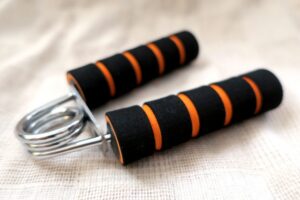 イスの背を軽く持ちながらかかとを上げて落とすだけ。
