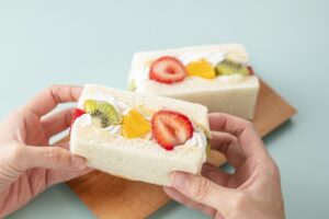• 断面の美しさに心躍るフルーツサンドを、ピクニック気分でいただく。
