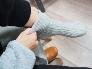 体が冷えるのは足元から。厚手の靴下やレッグウォーマー、スリッパを使うと体感温度がぐっと上がります。特にフローリングは冷えやすいため、ラグやカーペットを敷くだけでも効果的です。