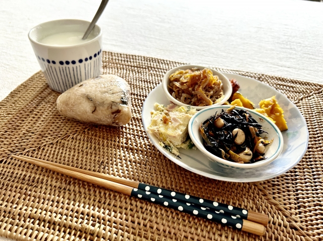 朝:温かい味噌汁+ごはん少なめ+果物少し